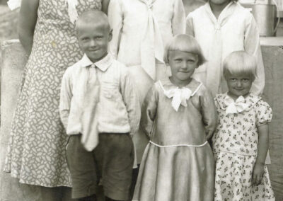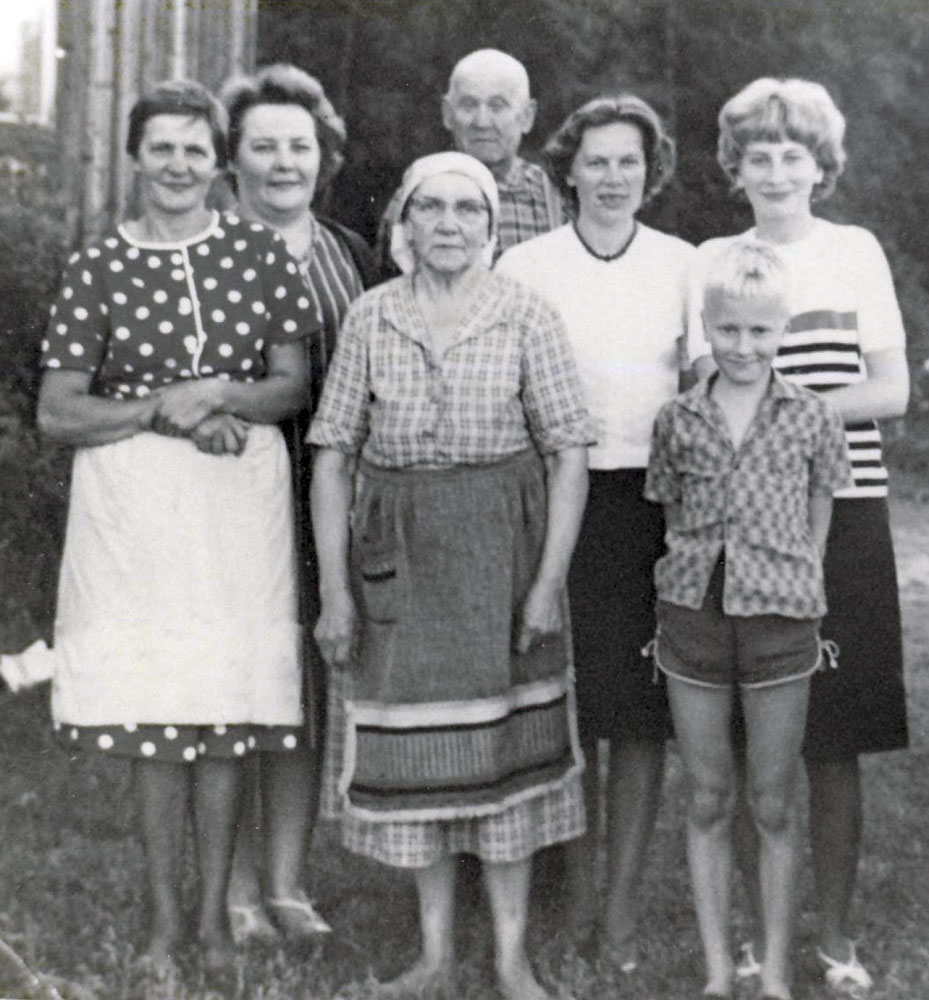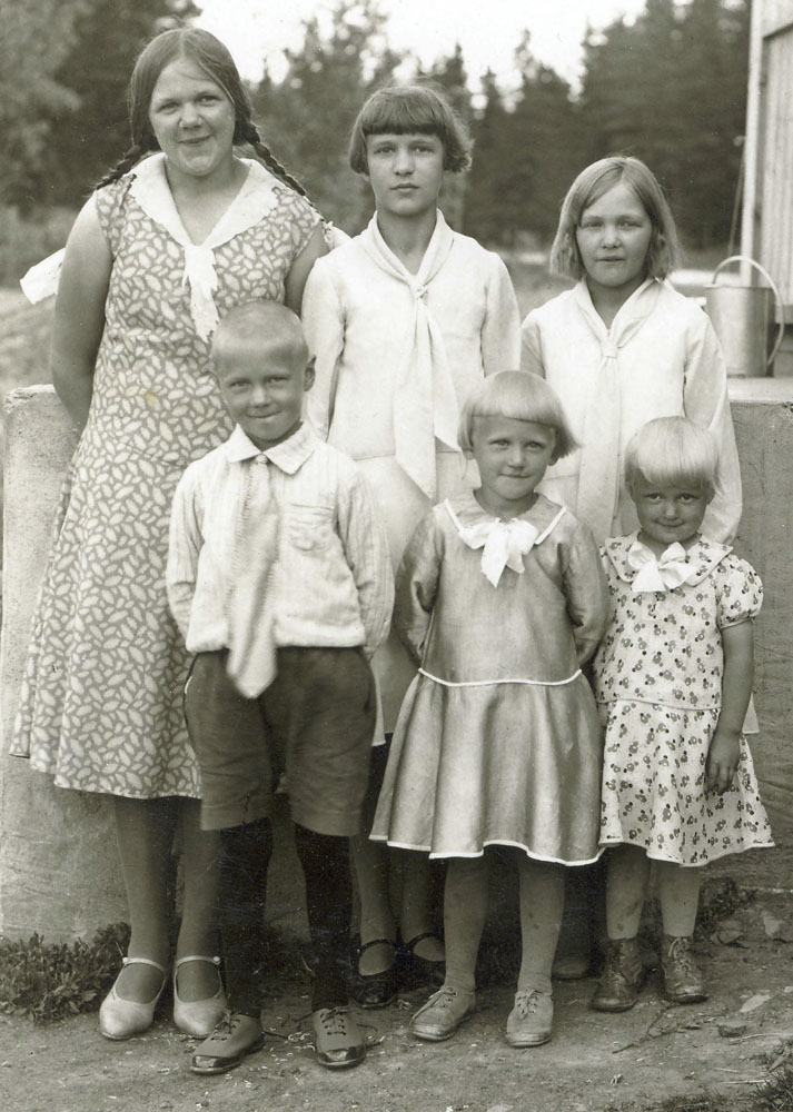 Ojasen sisarukset: Tyyne (takana vas.), Martta ja Aune. Edessä Mauno, Anna-Liisa ja Helvi.