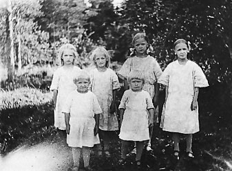 Ojasen tyttäret: takarivissä oikealta Laura, Tyyne, Elvi, Martta ja edessä Aune ja Helena